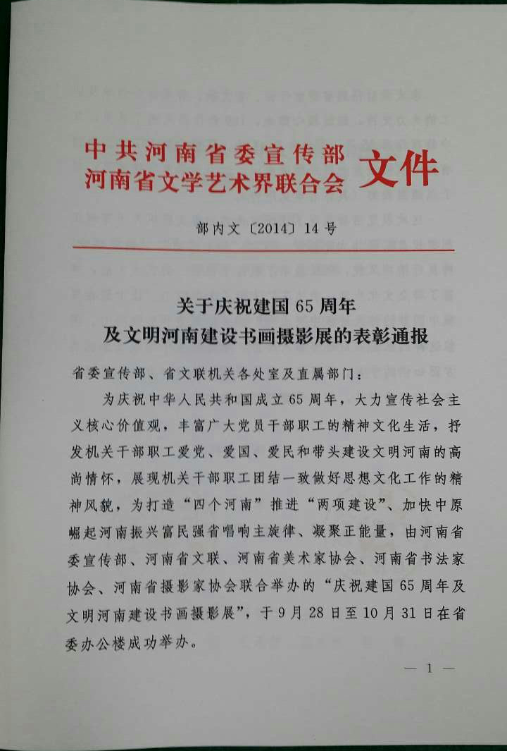 關(guān)于慶祝建國(guó)65周年 及文明河南建設(shè)書(shū)畫(huà)攝影展的表彰通報(bào)